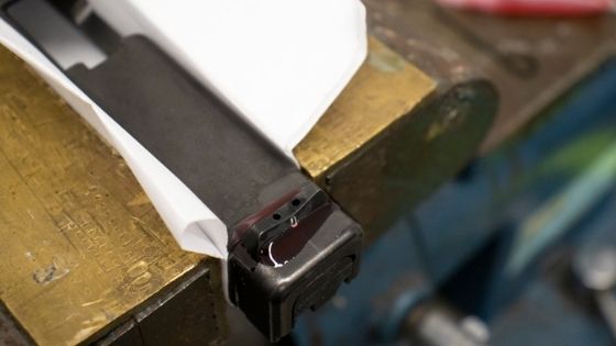 To ensure proper centering on the slide, we recommend placing the slide on a table with the sight installed and take a few steps away from the table. After taking a step back it is easy to see if the sight is massively off-center. Think about hanging a picture frame on a wall; from a few feet away, it is reasonably easy to tell if the frame is level or not, but not as easy to see if you are standing directly under the frame.